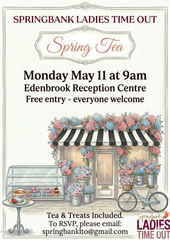Join us Monday May 11 at 9am at Eden Brook Reception Centre for our annual Spring Tea. Our French theme will feature treats and coffee, as well as door prizes. Entry is free, everyone is welcome!